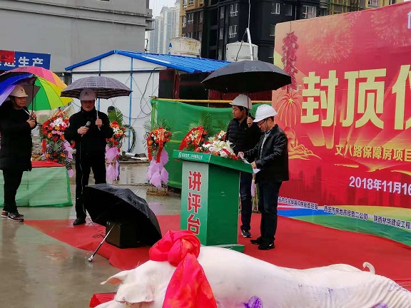 11月16日星期五丈八路保障房項目的施工現場,禮炮在片片雨云中炸響,鞭炮粘著雨花淅淅的散落著,雖然下著小雨,但是現場依舊人山人海,熱鬧非凡;10點50分隨著項目指揮長邢京平同志的聲音響起,丈八路項目封頂儀式正式開始。丈八路保障房項目4號樓主體順利封頂,標志著丈八路項目再一次完成了重要節點性的施工任務,這是所有現場施工人員堅持不懈的努力下共同完成的勞動成果;開發單位西安市經營二公司書記王備戰同志在講話中對現場施工人員的工作予以高度肯定,并再三叮囑大家要再接再厲完成好后續工作,參加本次活動的還有建設單位各級領導,監理單位總監及各專業工程師,施工單位西安市第二住宅建筑公司副經理杜軍、技術總工劉琪、指揮長邢京平、現場負責人陳衛民及各級現場施工人員。